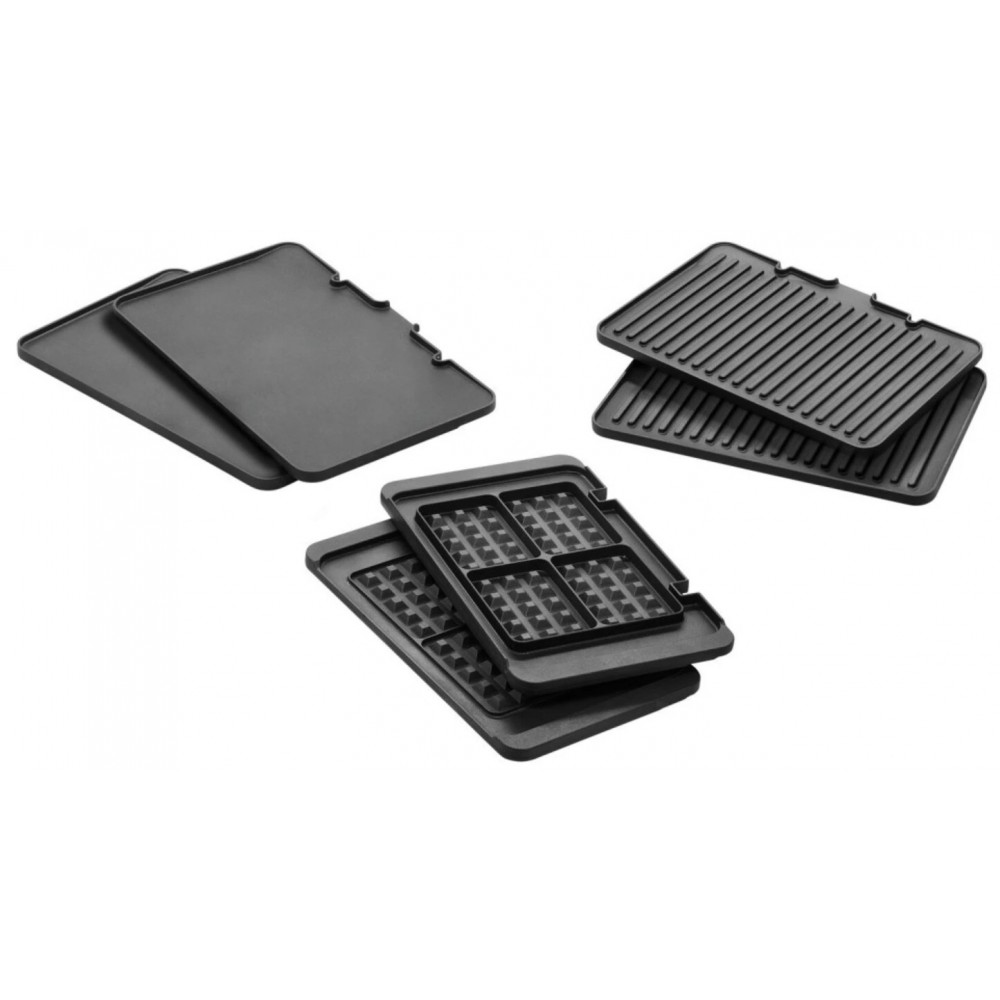 | Основная комплектация | 2 панели для вафель, 2 панели для гриля, гладкая панель (2 шт.), документация, лопатка, лоток для жира |