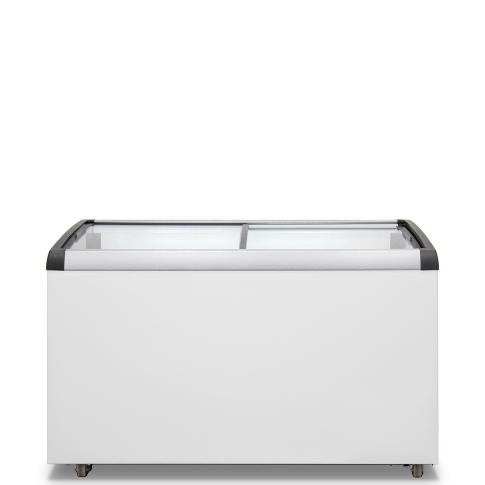 Особенности | Морозильный ларь с гнутыми раздвижными стеклами • цвет корпуса Белый, цвет короны Серебристо-черный • диапазон температуры -18...-25°C • LED-подсветка внутреннего объема • механическое управление • 5 корзин в комплекте • 4 колеса со стопором • габариты 88,5x132x66,5см • объем 410л • работа при напряжении в сети 170-242В • климатический класс 5 (+40°С; 40% |